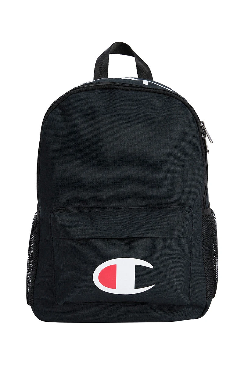 - • Backpack and cap both feature Champion script branding
