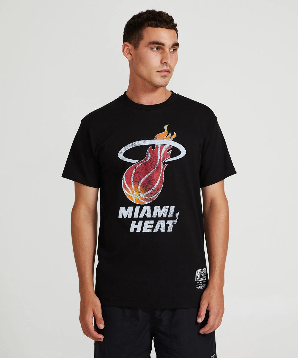 The Miami Heat Logo T-Shirt by Mitchell & Ness is a vintage styled basketball tee which comes in a black colourway. Designed from a soft cotton fabric with distressed detailing, the style features a relaxed fit, short sleeves, crew neck and a large Miami Heat logo on the chest. Wear to the pub or to a game and you’re set to cheer.