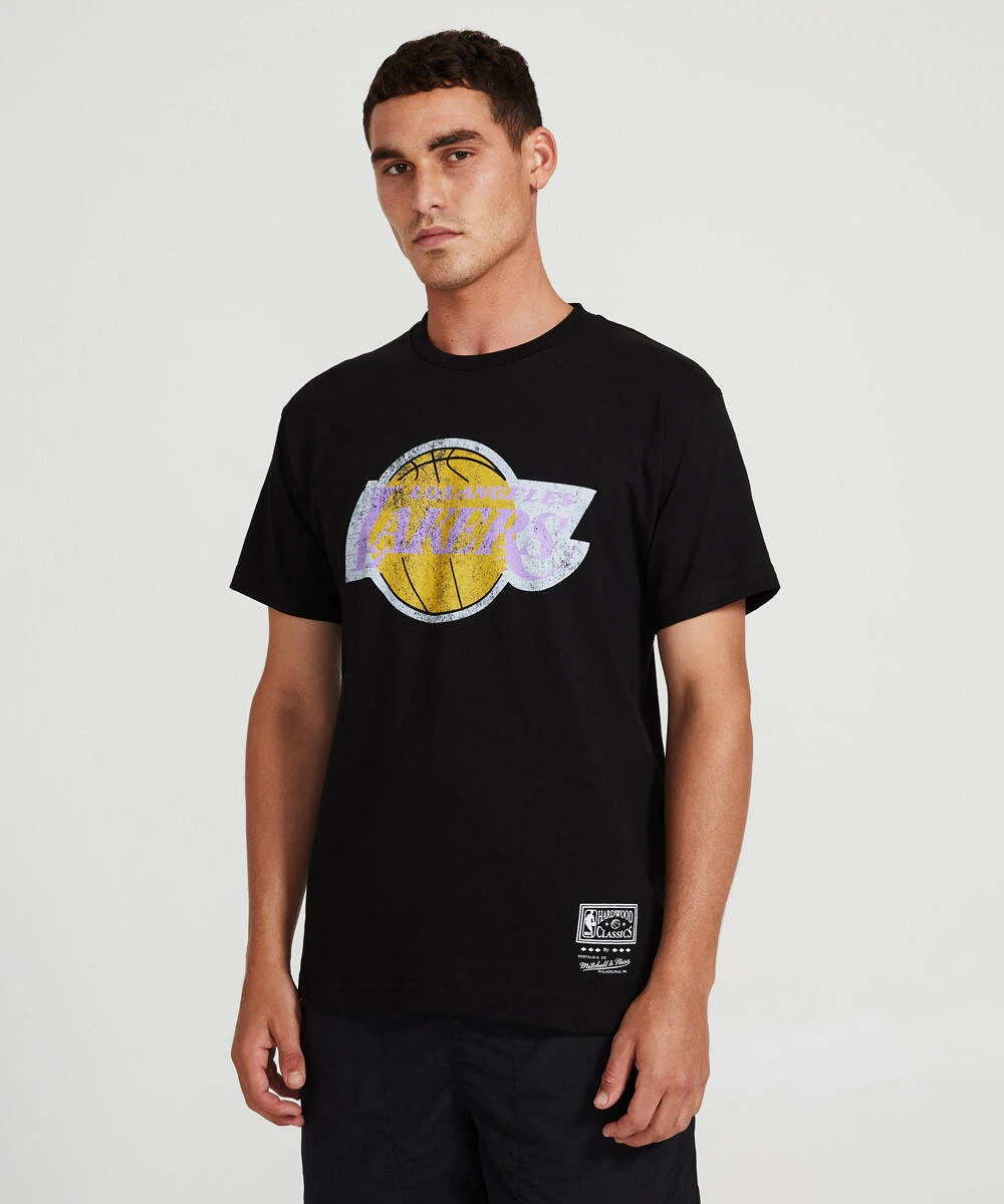 The L.A. Lakers Logo T-Shirt by Black is a distressed tee which comes in a black colourway. The style feature a crew neckline, short sleeves and a large L.A. Lakers logo on the chest. Team the look with sneakers and baggy basketball shorts.