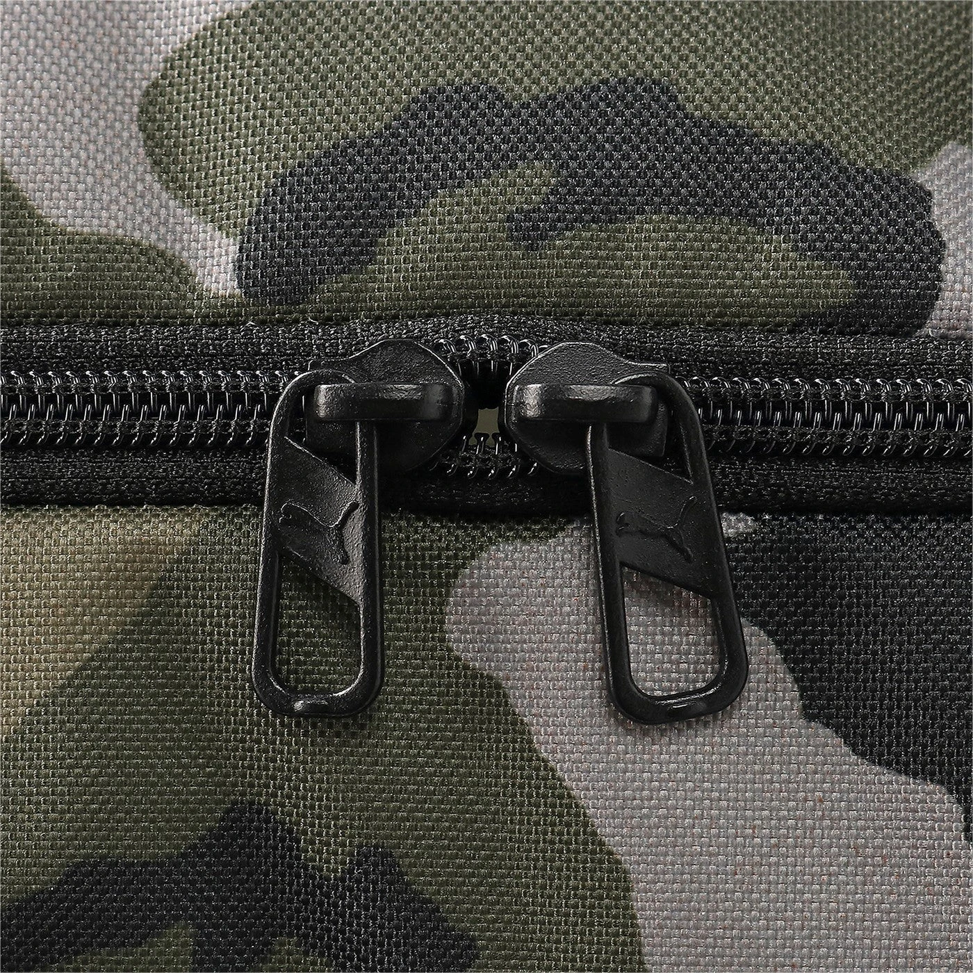 Two-way zip opening into main compartment, one side zip compartment with shoe inlay and metal eyelit, one flat side zip pocket, one side mesh pocket, webbing carry handles with padded handle grip, connectable through hook- and- loop closure, fully detachable, adjustable shoulder strap with branded shoulder pad, D- ring on main body for possible attachments, padded bottom panel with PU material, branded 150D Polyester lining with PU backing, PUMA branded metal zip pullers on main compartment, branded metal zip puller on side compartments, big PUMA wordmarked logo print on front panel.
