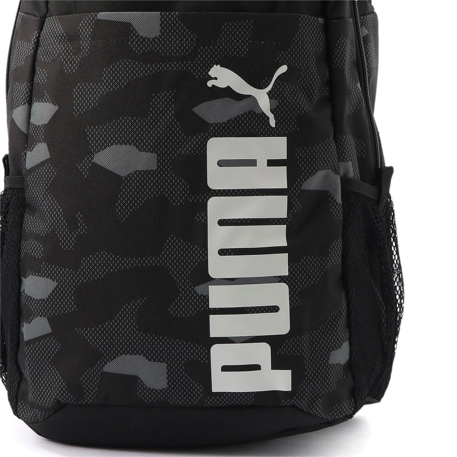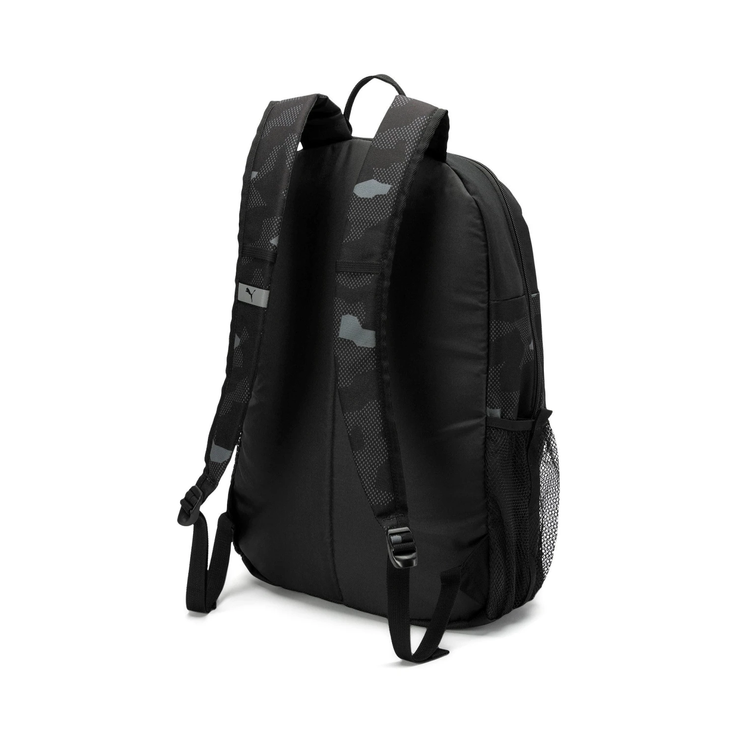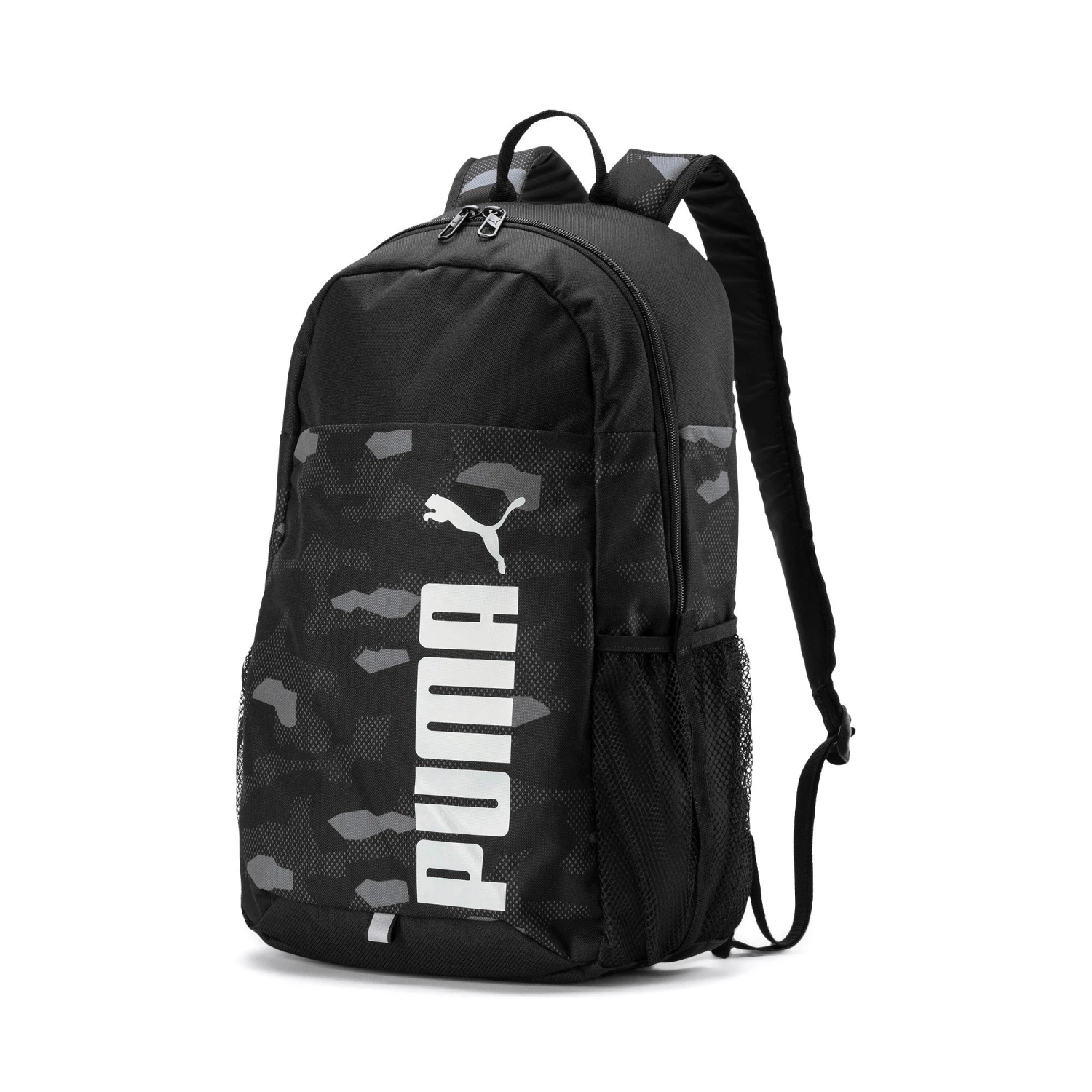The PUMA Style Backpack- get ready for the urban jungle! A deep front pocket, two mesh pockets, webbing loops on the curved shoulder straps and a cool camoflage print. With this Backpack you will stand out from the crowd. Two-way zip opening into main compartment, zip opening into front pocket, elastic lining compartment inside main compartment, two side mesh pockets with webbing stripe, adjustable and padded shoulder straps with reflective PUMA Cat branded loop and webbing loops, webbing carry handle, webbing stripes on front bottom panel, padded back panel with stitching line, PUMA branded 150D Polyester lining with PU backing, branded metal zip puller’s on main compartment, branded metal zip puller on front pocket, reflective tape with PUMA Cat branding and PUMA wordmarked logo print on front panel.