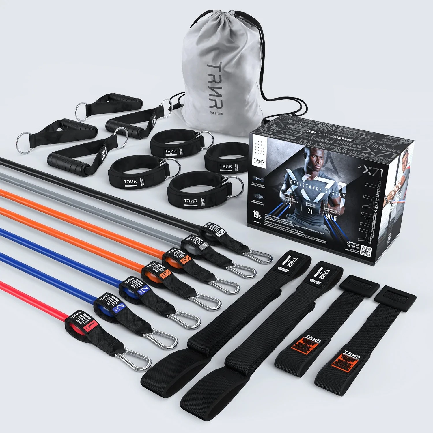 A strength training system for two, the TRNR X71 Resistance System is here to revolutionise the way you train, bringing you a more efficient, varied, and safer workout – anywhere, anytime. Stronger, more defined arms, legs, pecs, abs, glutes, and back muscles have never been more achievable with this unique system that rivals an entire gym arsenal – despite fitting into a small bag. The progressive resistance throughout the entire range of motion maximises your results whilst being gentle on your joints. The Stackable Clip System enables you to mix up your routine and stay motivated. Select your favourite gym and Pilates exercises from the poster included and stack or remove resistance (3.4 kg up to 90.5 kg) to suit your personal needs. The door and outdoor anchors open a world of exercise possibilities by letting you move in multiple directions. Setup is quick and easy – all you need is a door or a fixed object like a bench, tree, or pole. Switching from upper to lower body workouts only takes seconds by swapping the handles for the ankle straps.